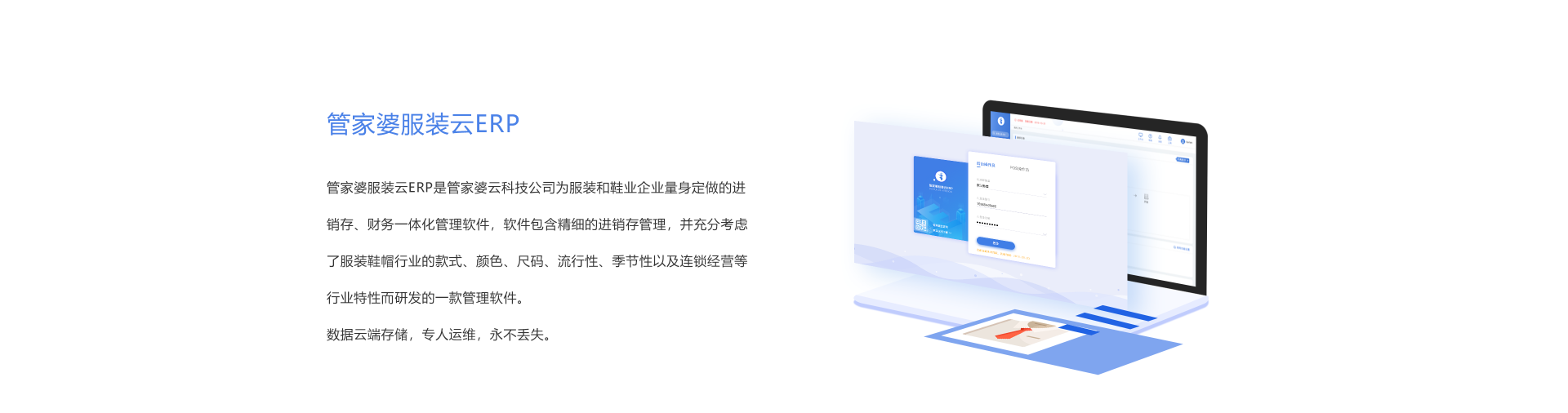 管家婆服裝云ERP是管家婆云科技公司為服裝和鞋業(yè)企業(yè)量身定做的進(jìn)銷存、財(cái)務(wù)一體化管理軟件,軟件包含精細(xì)的進(jìn)銷存管理,并充分考慮了服裝鞋帽行業(yè)的顏色、尺碼、流行性、季節(jié)性以及連鎖經(jīng)營(yíng)等行業(yè)特性而研發(fā)的一款管理軟件。數(shù)據(jù)云端存儲(chǔ),專人維護(hù),永不丟失。